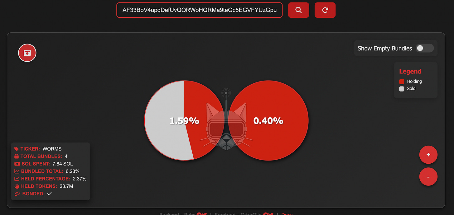 O Trench Bot é focado nos chamados Bundles: conjunto de transações realizadas de uma vez só. Na página inicial, você pode colar o contrato de qualquer memecoin do pump.fun ou um endereço na Solana, e a plataforma rastreará se os criadores da moeda a compraram logo no lançamento.