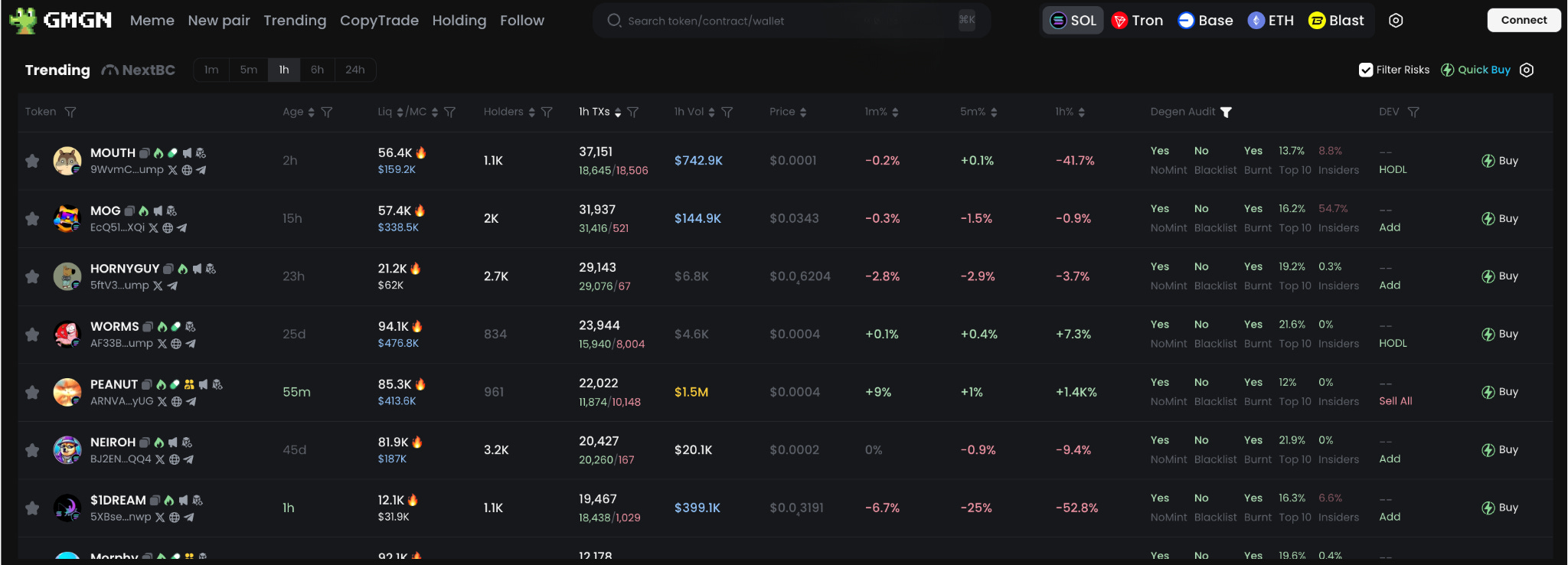 O GMGN possui várias ferramentas que auxiliam no trading de tokens, mas o que o destaca é o CopyTrade. Após conectar sua carteira e seu Telegram, você pode escolher endereços que deseja seguir, carregar sua carteira com SOL e ela copiará todas as suas compras e vendas.