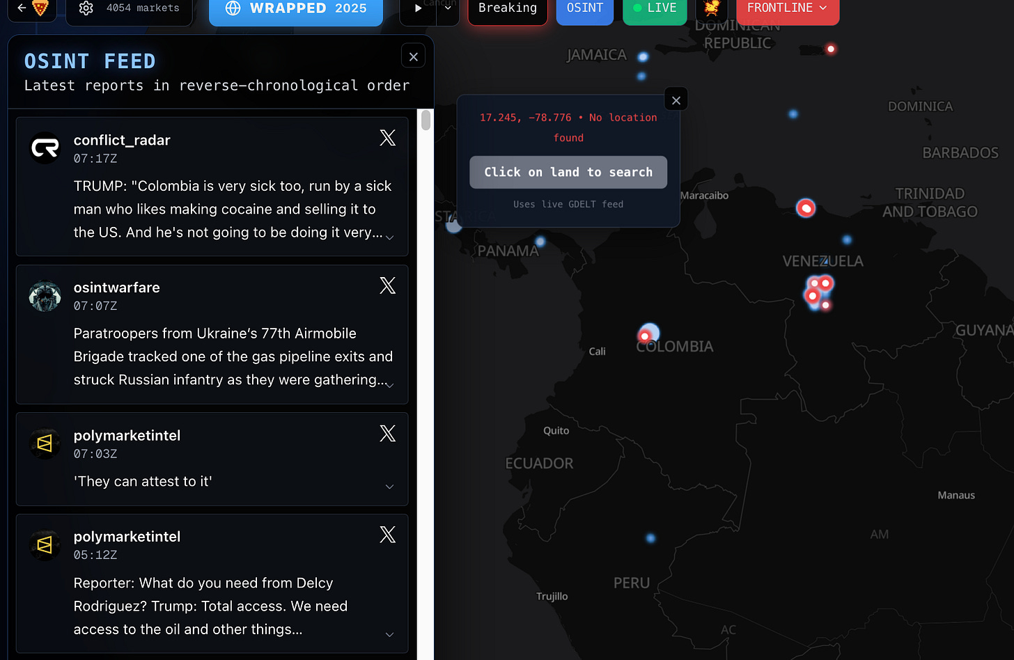 Ao mesmo tempo, nas abas “OSINT” e “Breaking”, foi possível acompanhar em tempo real novas informações sobre o conflito na Venezuela e a volatilidade atípica do mercado relacionado à possível captura de Maduro.