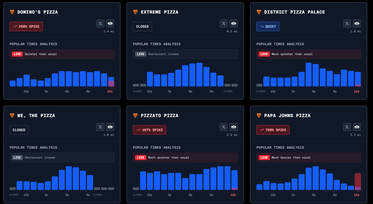 O indicador acompanha picos anormais no volume de pedidos das pizzarias da região. Quando isso acontece, costuma coincidir com conflitos em outras partes do mundo ou com operações conduzidas pelos EUA.