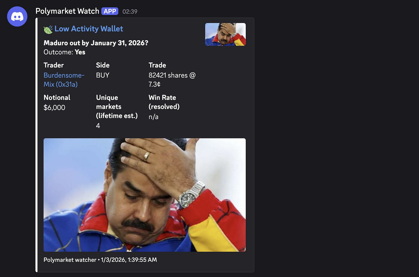 Uma solução mais complexa, mas já adotada por traders na Polymarket, é a criação de bots para rastrear carteiras com movimentações anômalas. Um deles relata ter recebido alertas de cinco carteiras potencialmente insiders investindo US$ 6K na possível captura de Maduro.