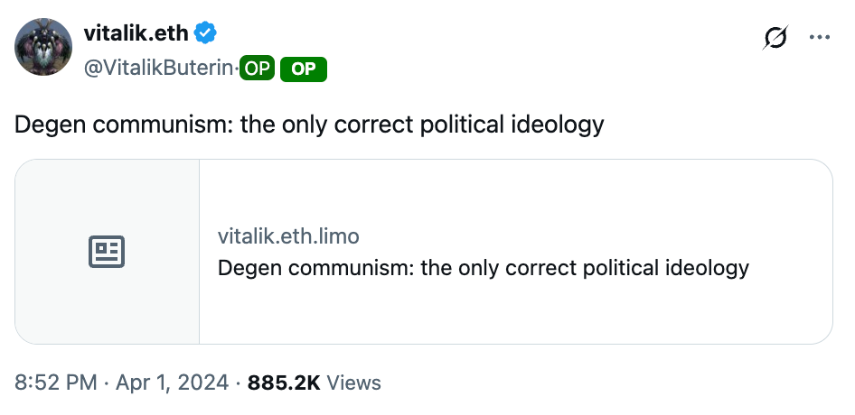 No 1º de abril de 2024, Vitalik Buterin publicou um post provocativo intitulado “Comunismo degen: a única ideologia política correta”.