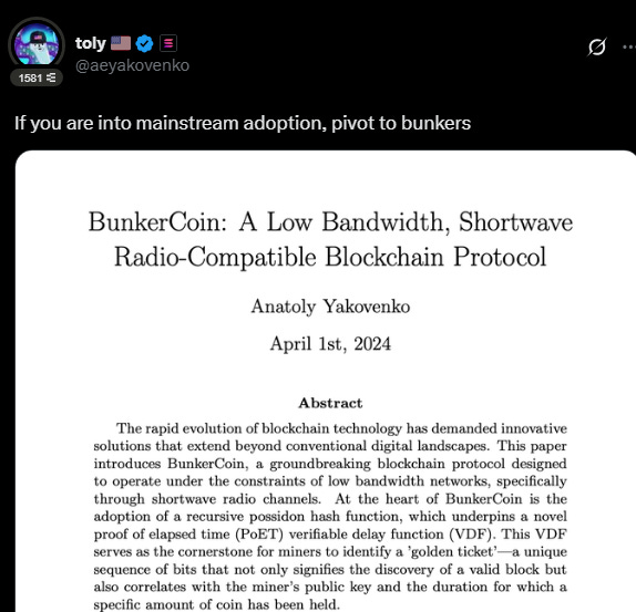 O fundador da Solana, Anatoly Yakovenko, lançou no ano passado um whitepaper para um token fictício: BunkerCoin, uma blockchain operando via ondas curtas de rádio.
