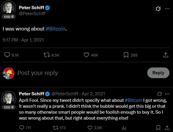 “Eu estava errado sobre o #Bitcoin”, escreveu Schiff em 1º de abril de 2021.