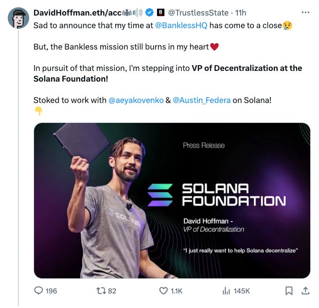 David Hoffman, co-fundador da Bankless, anunciou que estava deixando o ecossistema Ethereum para se tornar VP de Descentralização da Solana Foundation.