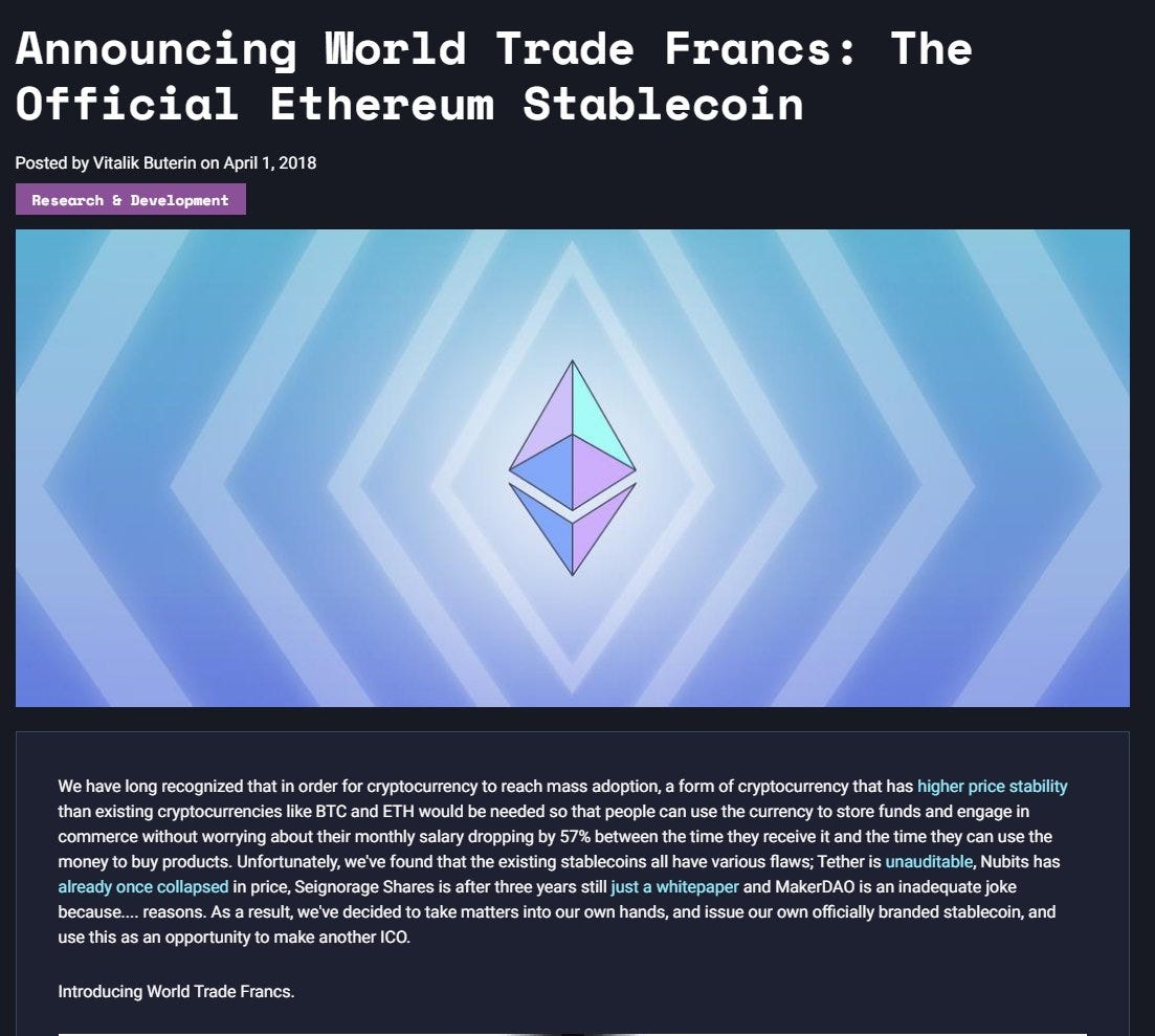 Vitalik Buterin “anunciou” em 1º de Abril de 2018 o World Trade Francs, uma nova stablecoin lastreado em ETH, com direito a whitepaper, ICO e críticas aos concorrentes.