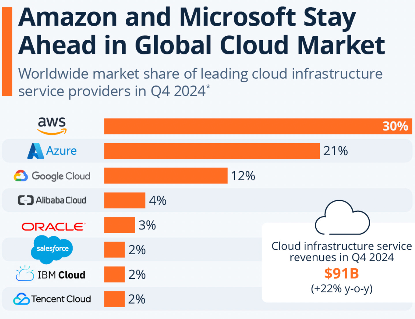 Ao construir um aplicativo, uma plataforma, é necessário hospedá-lo em algum lugar. Os provedores de serviço centralizados, como Amazon (AWS), Microsoft (Azure) e Google (Google Cloud) representam 63% deste segmento. As big techs dominam o setor.