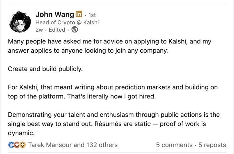 Duas semanas antes, Wang havia publicado no LinkedIn que a melhor forma de se candidatar à empresa era “criar e construir publicamente”.