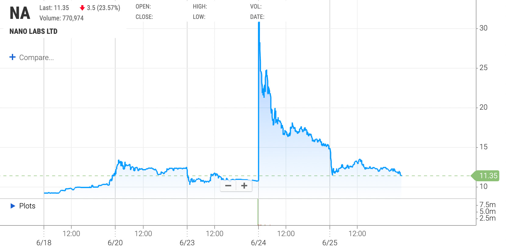 Hoje, ter uma Altcoin/Bitcoin Treasury Company não é mais novidade como já foi. Se tornou comum ver gráficos como o das ações da Nano Labs: uma valorização repentina no dia do anúncio, e sua queda nos próximos dias. Deixou de ser novidade, e se tornou algo comum.