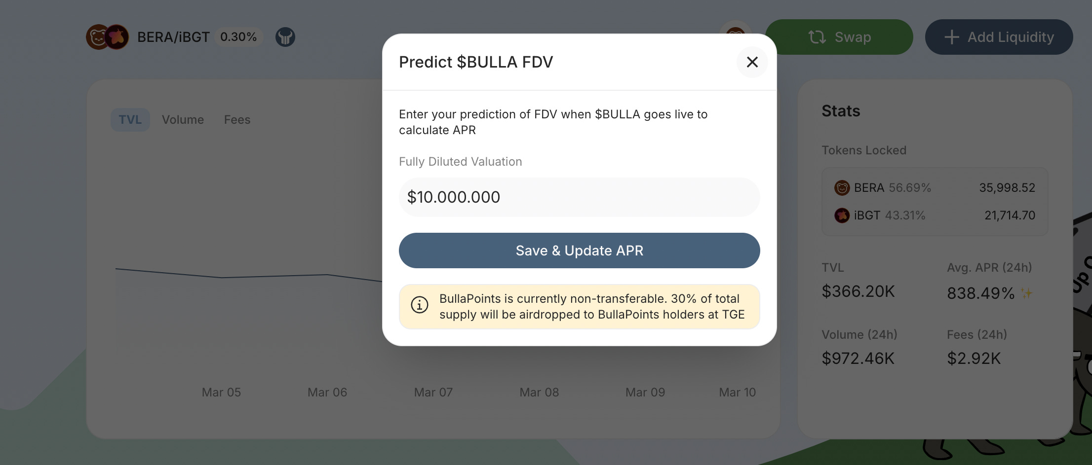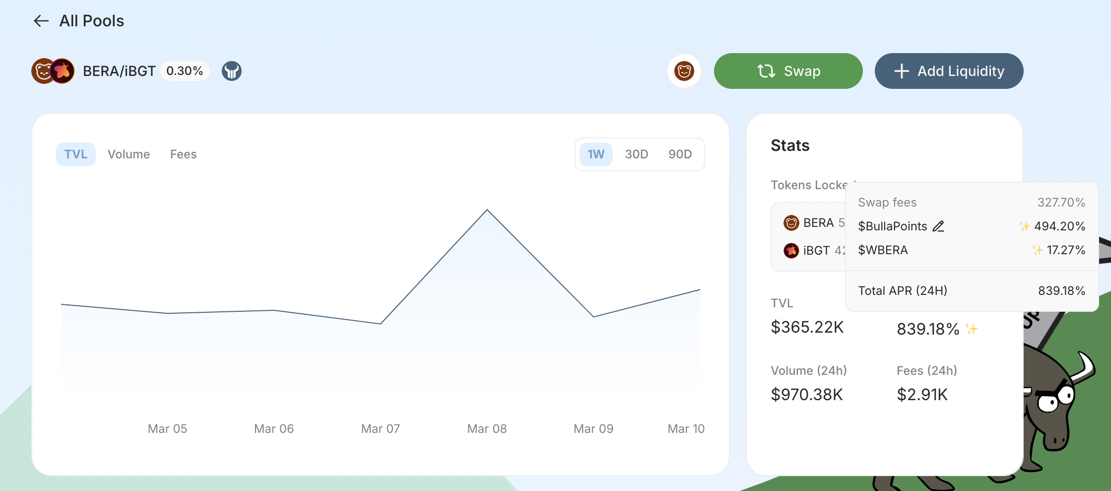 Na pool de BERA/iBGT, é possível ganhar “494% a.a. em Bulla Points”. Em outras palavras, os pontos recebidos por prover liquidez no protocolo, quando convertido para tokens “de verdade”, serão o equivalente a uma rentabilidade a 494% a.a.