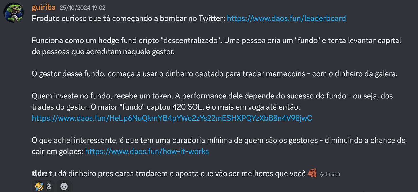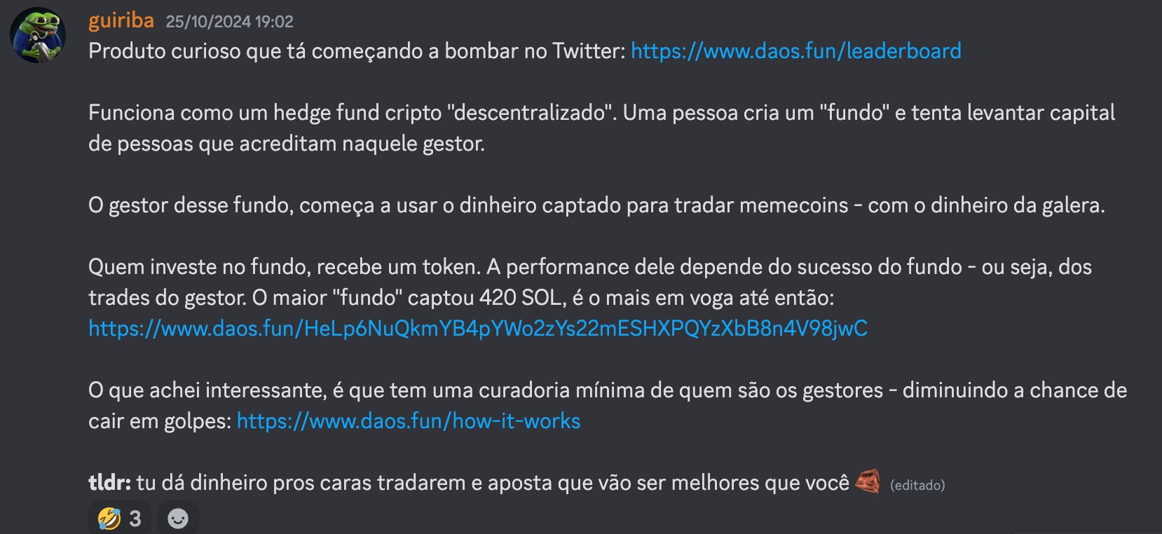 Na sexta-feira a noite (um dia antes da valorização do $AI16Z), falamos sobre a plataforma, explicamos seu racional e deixamos o link para nossos membros PRO se exporem ao $AI16Z. No dia, era a forma mais “segura” de se expor a atenção e sucesso do daos.fun.