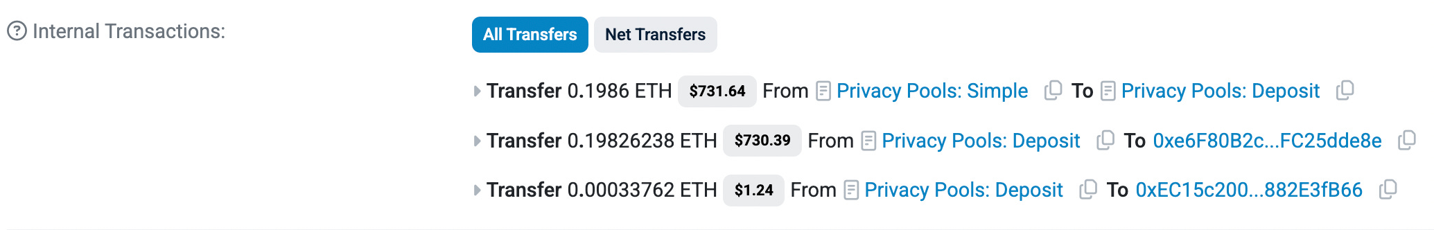 Ao realizar um saque na Privacy Pools, a transação final parecerá com esta acima: