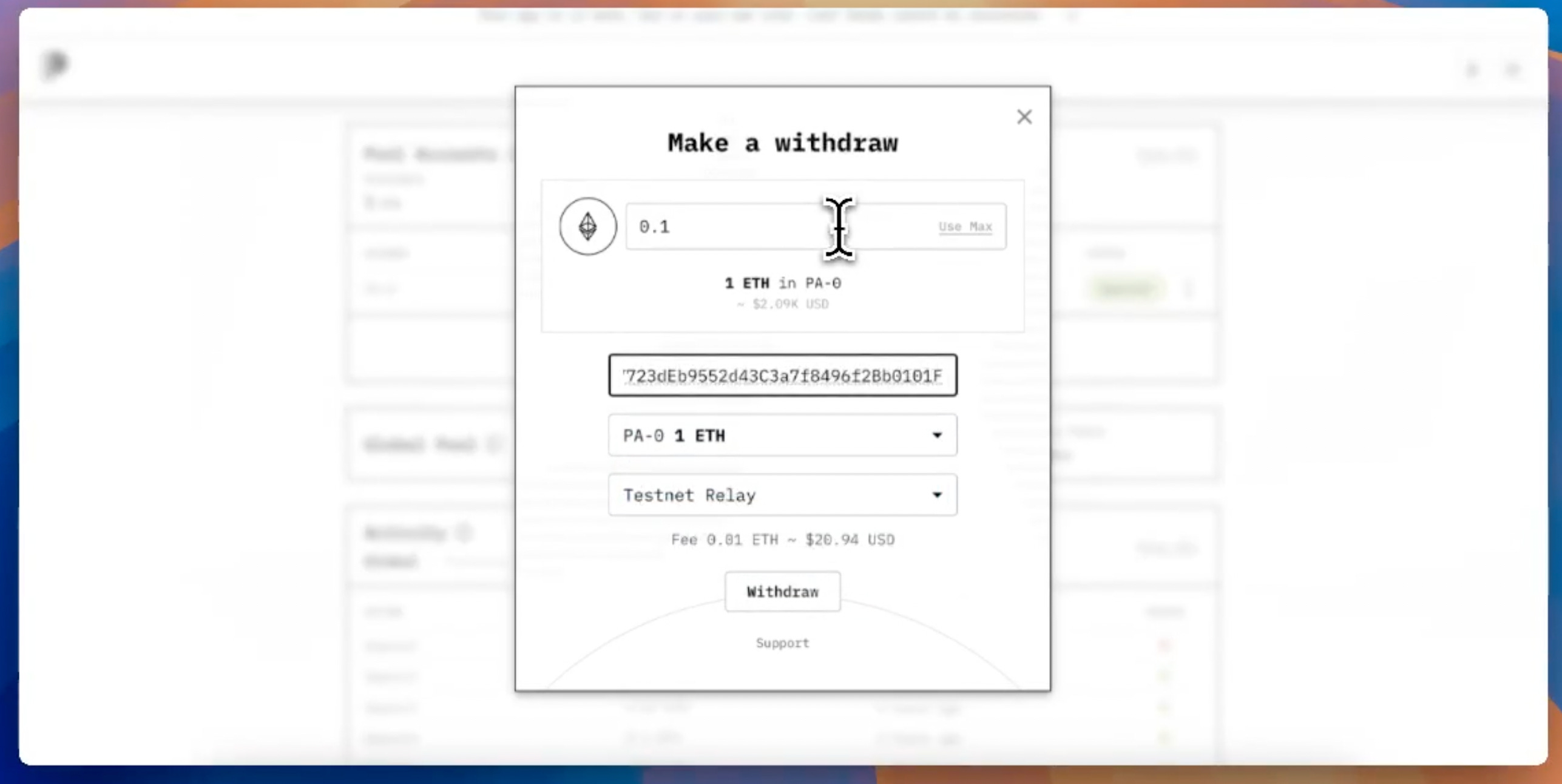 Clicando em Withdraw, a plataforma permitirá você escolher de onde tirará o dinheiro, seu destino e a quantia a ser sacada. A melhor opção, quando realizar um saque, é enviar outro endereço - se o objetivo for anonimizar seu ETH.