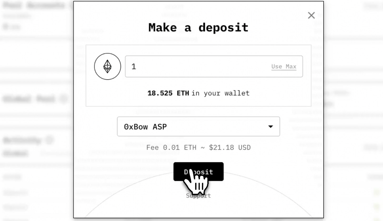 Para depositar, basta clicar em Deposit, selecionar a quantia desejada e novamente em Deposit. O 0xbow ASP é a entidade responsável por transmitir e analisar a transação. 0xbow é nome do time que desenvolveu o Privacy Pools.