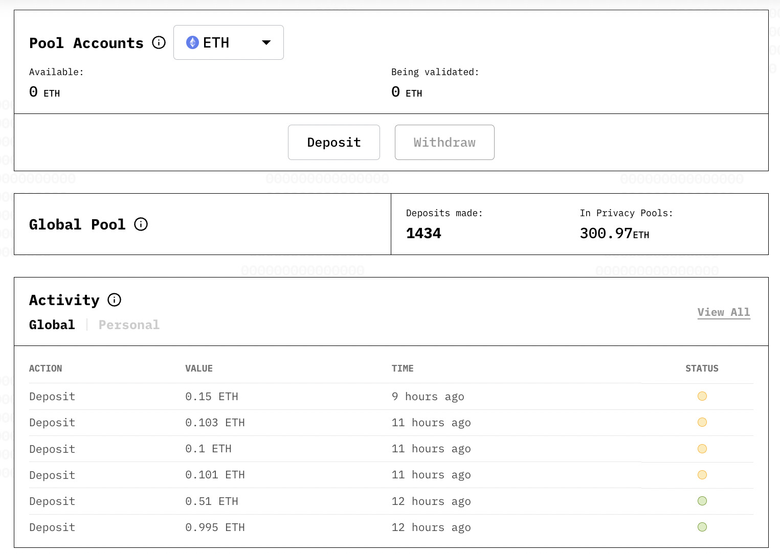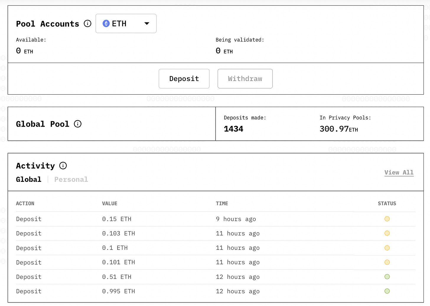 Global Pool: O explorador do Privacy Pools. Hoje, tem 300.97 ETH depositados no protocolo, e 1434 depósitos já foram realizados. É possível ver a transação e endereço de quem coloca dinheiro no projeto, mas não para onde vai.