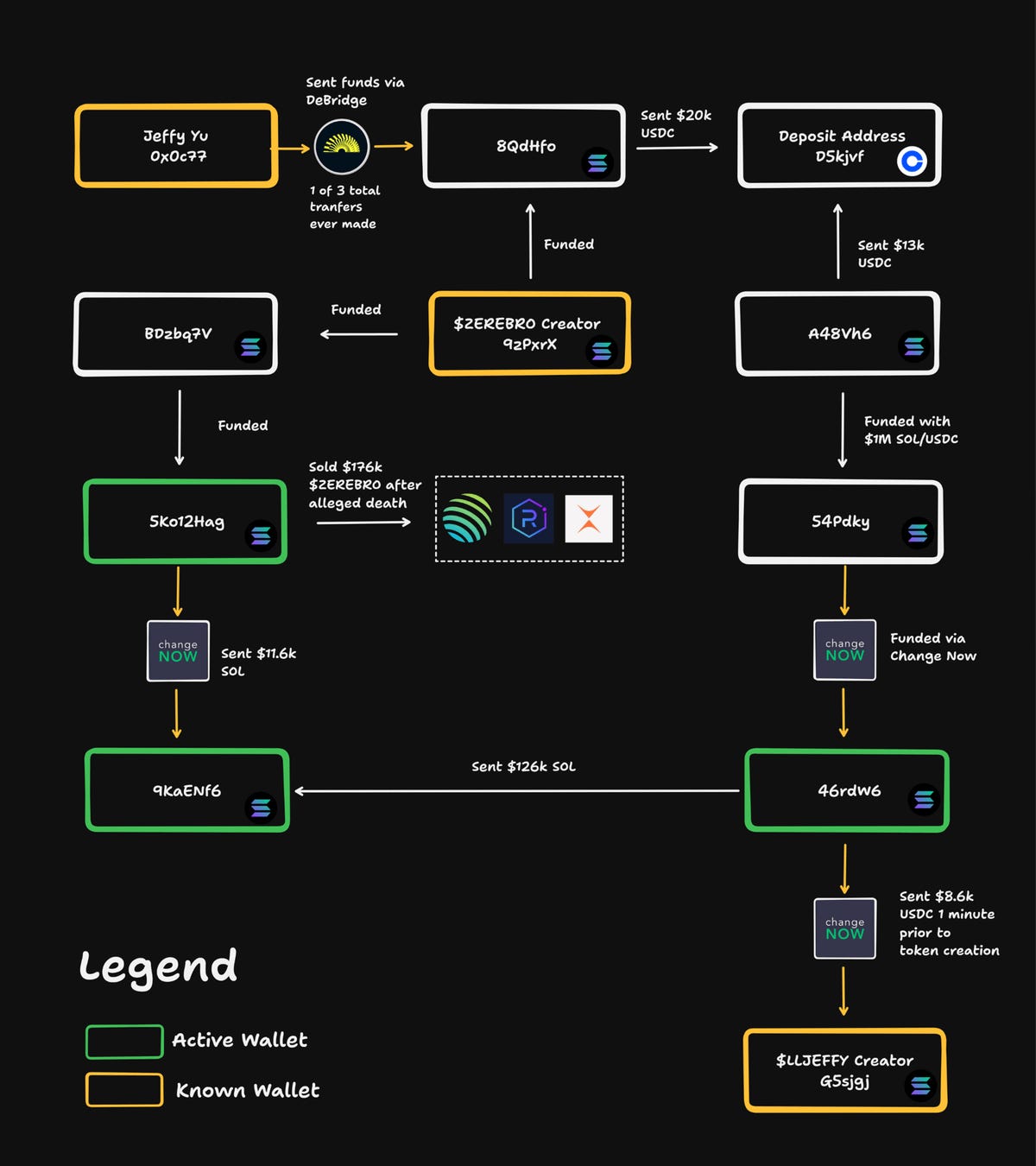 Em paralelo à suposta morte de Jeffy, uma memecoin foi criada: a $LLJEFFY. O token foi criado em homenagem ao criador da Zerebro. Vários dos endereços pertencentes a ele, interagiram com a moeda criada em sua homenagem.