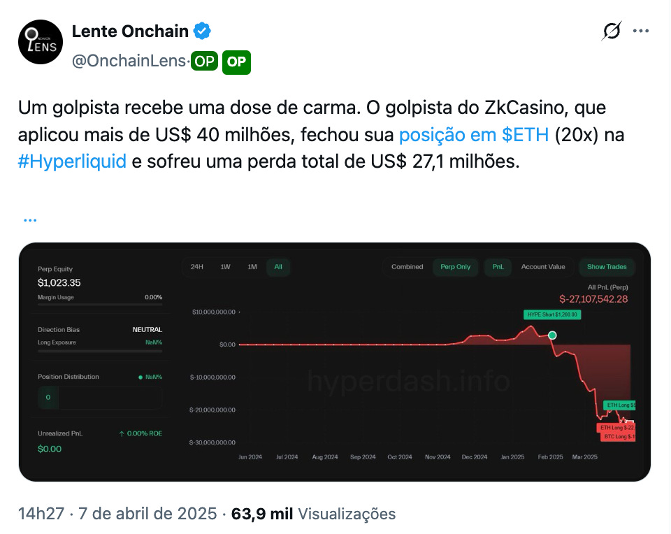 Neste mês de abril, a criptoesfera acompanhou um capítulo inesperado de um dos golpes mais comentados do último ano: o fundador do ZKasino perdeu US$27 milhões de recursos roubados apostando na alta do ETH na Hyperliquid.