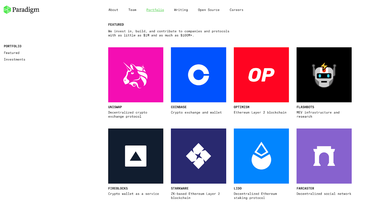 O resultado? A Paradigm virou símbolo de rigor técnico e visão de longo prazo. Anos depois, possui atualmente mais de 100 investimentos realizados com um retorno médio de 571x, ou 57.000%. Alguns de seus principais cases de sucesso são mais perenes e consistentes, como Uniswap, Coinbase, Optimism, Flashbots, Lido Finance, Chainnalysis, Fireblocks e Cosmos, já outros foram mais voltados ao hype momentâneo do mercado, como Blur, Blast e Friend Tech.