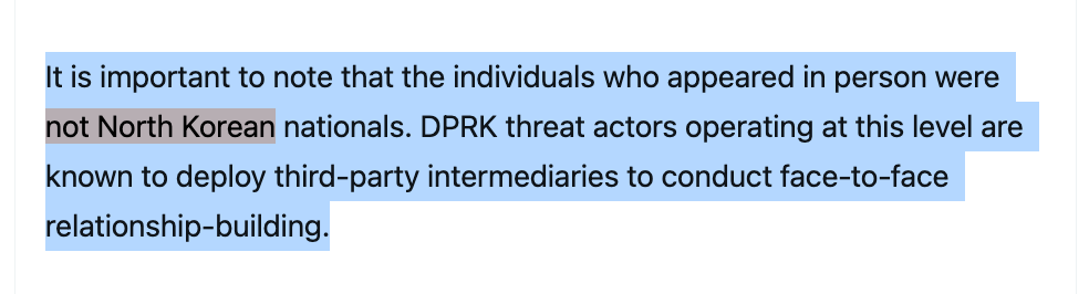 “Os indivíduos que apareceram presencialmente não eram cidadãos norte-coreanos.” A Coréia do Norte usa intermediários terceirizados pra relacionamento presencial — pessoas com identidades inteiramente fabricadas, incluindo históricos de emprego, credenciais profissionais e redes no LinkedIn que resistem a escrutínio.
