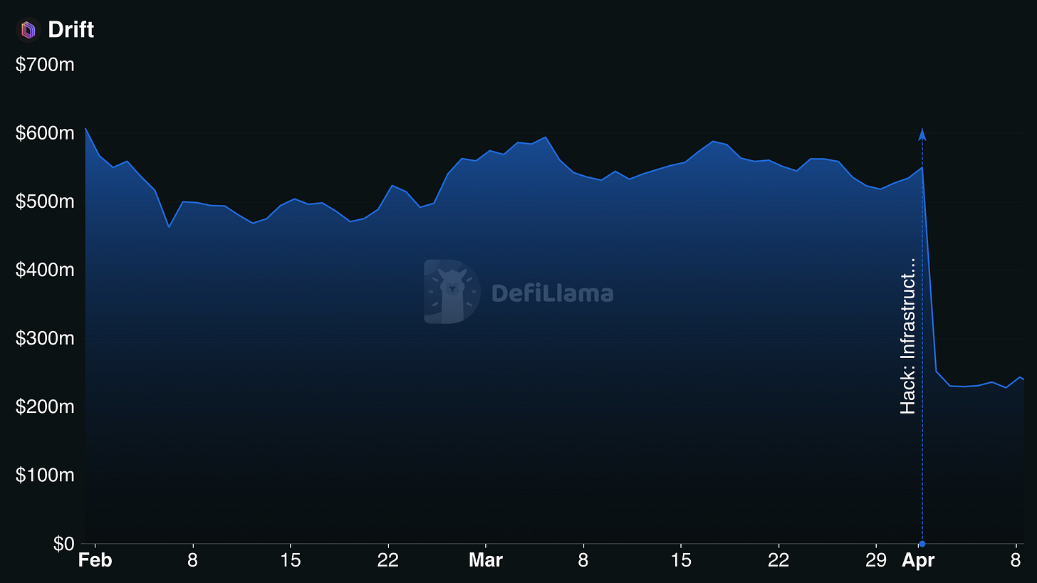 O impacto foi além da Drift. Mais de 20 protocolos Solana com exposição direta foram afetados. O TVL da Drift caiu de ~US$550 milhões pra ~US$232 milhões. O token DRIFT derreteu mais de 40%, batendo mínima histórica perto de US$0,033, queda de 98,5% em relação ao pico de novembro de 2024.