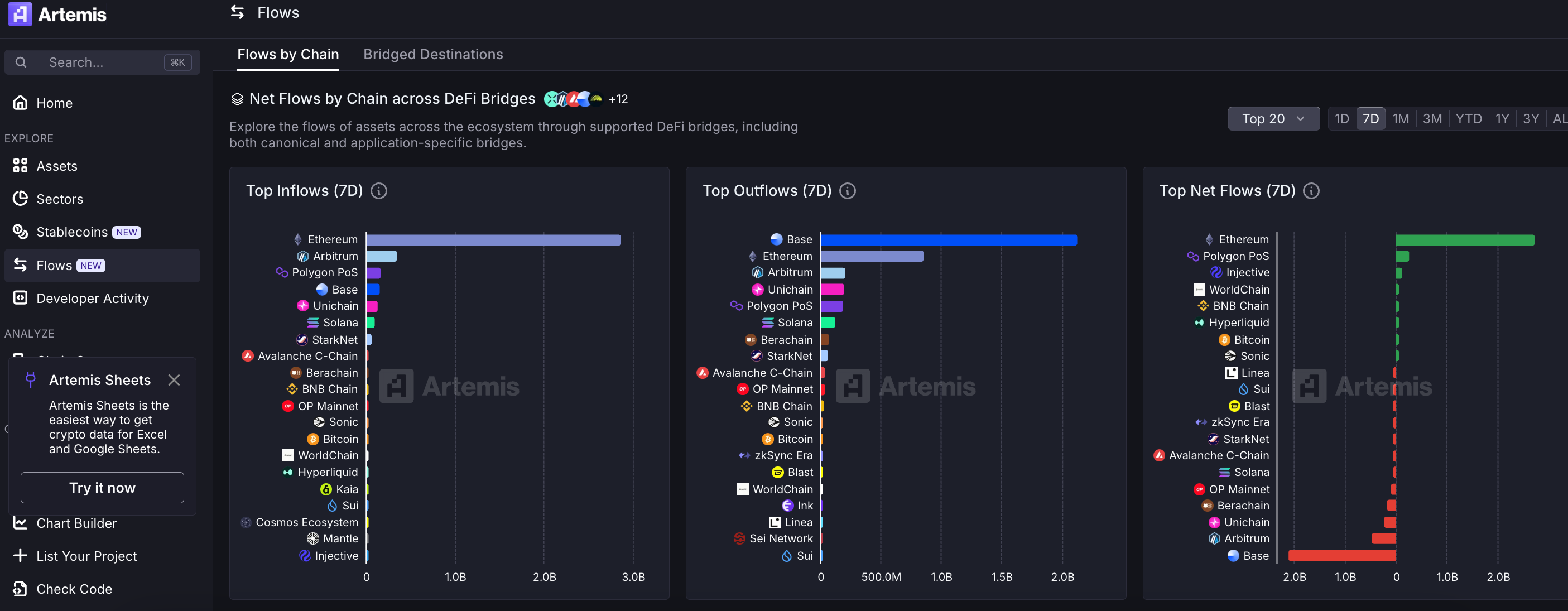 Top Bridged Net Flows: Pra onde o dinheiro está sendo bridgeado/enviado. Follow the money.