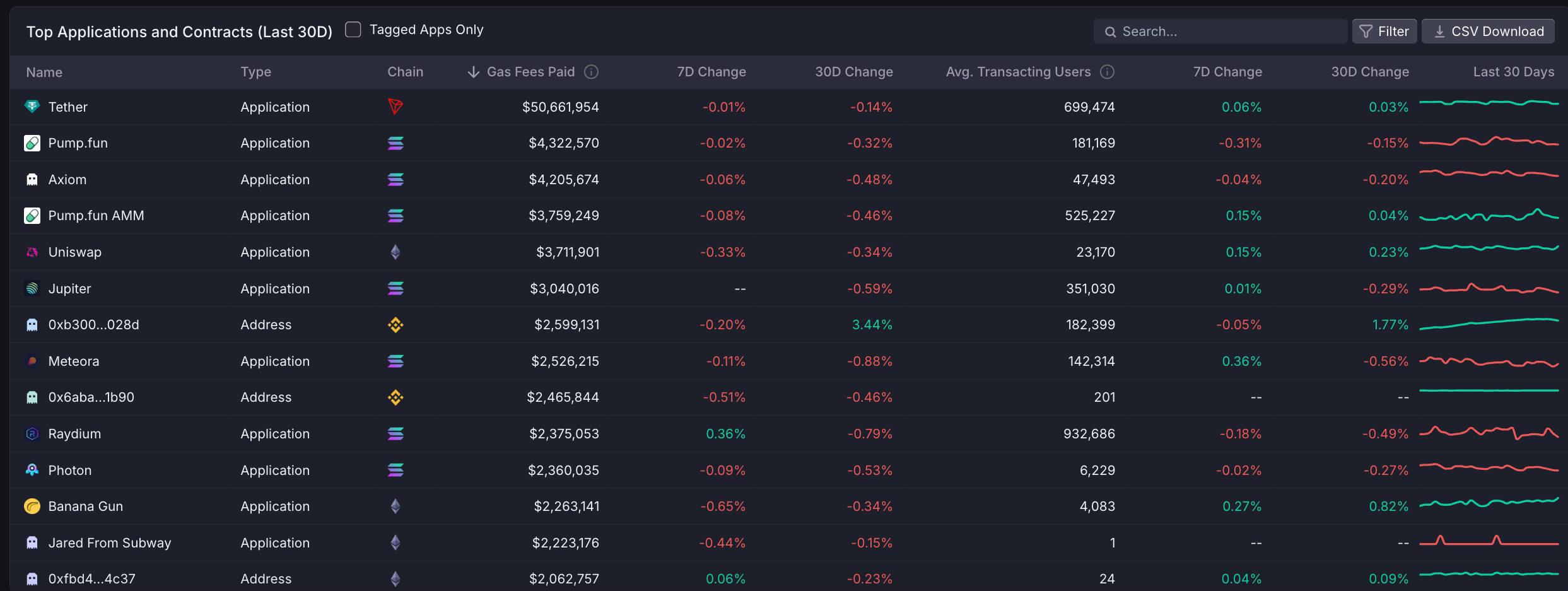 Quando vemos a lista, vários nomes conhecidos: Tether, pump.fun, Uniswap , Jupiter…e Axiom.