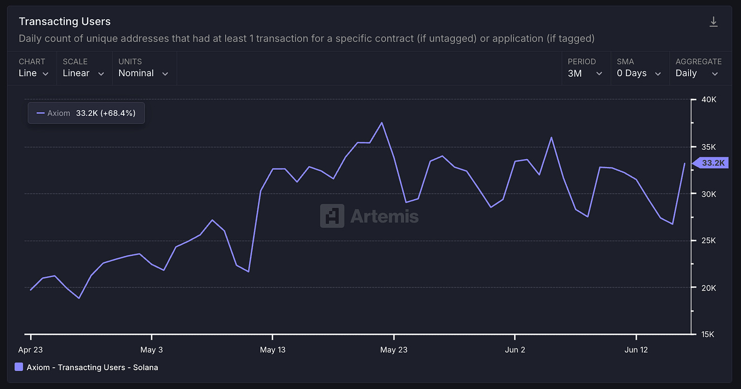 Nos últimos 3 meses, o número de usuários no Axiom aumentou 68,4%. As taxas pagas para interagir com a aplicação, 74.%. Estes dados demonstram um crescente interesse dos traders em utilizar o app.