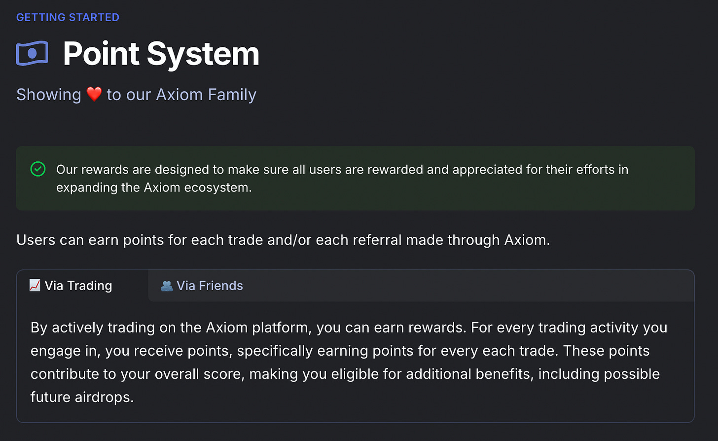 Analisando a documentação da Axiom e sua interface, descobrimos que estão com um programa de pontos ativo para trading e indicação de novos usuários.