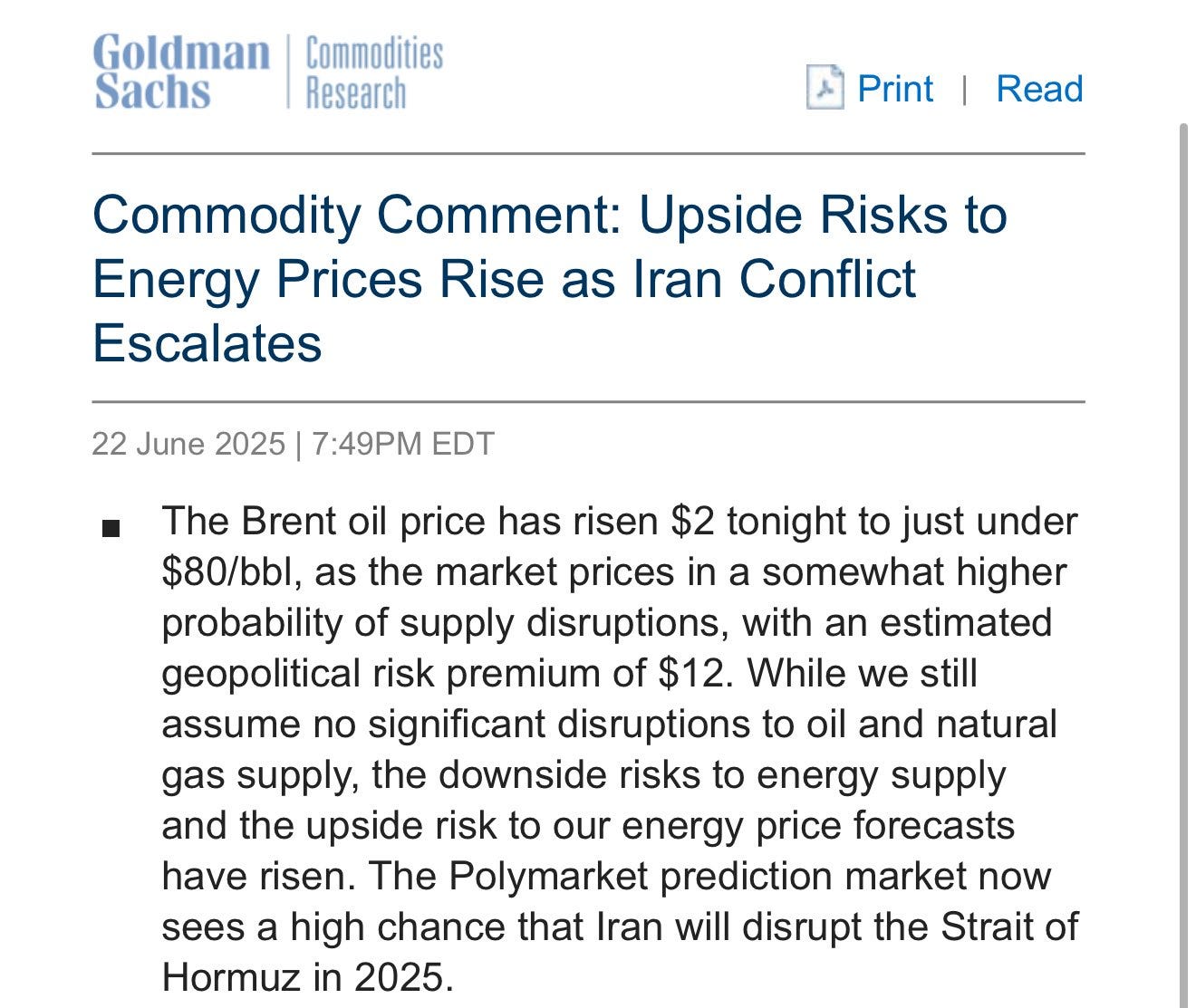 Ontem, a Goldman Sachs liberou um relatório, comentando a situação sobre o Irã e seu impacto no petróleo. Curiosamente, uma das fontes usadas por ela para avaliar o risco do Estreito de Hormuz ser fechado foi a Polymarket - um mercado preditivo criptonativo.