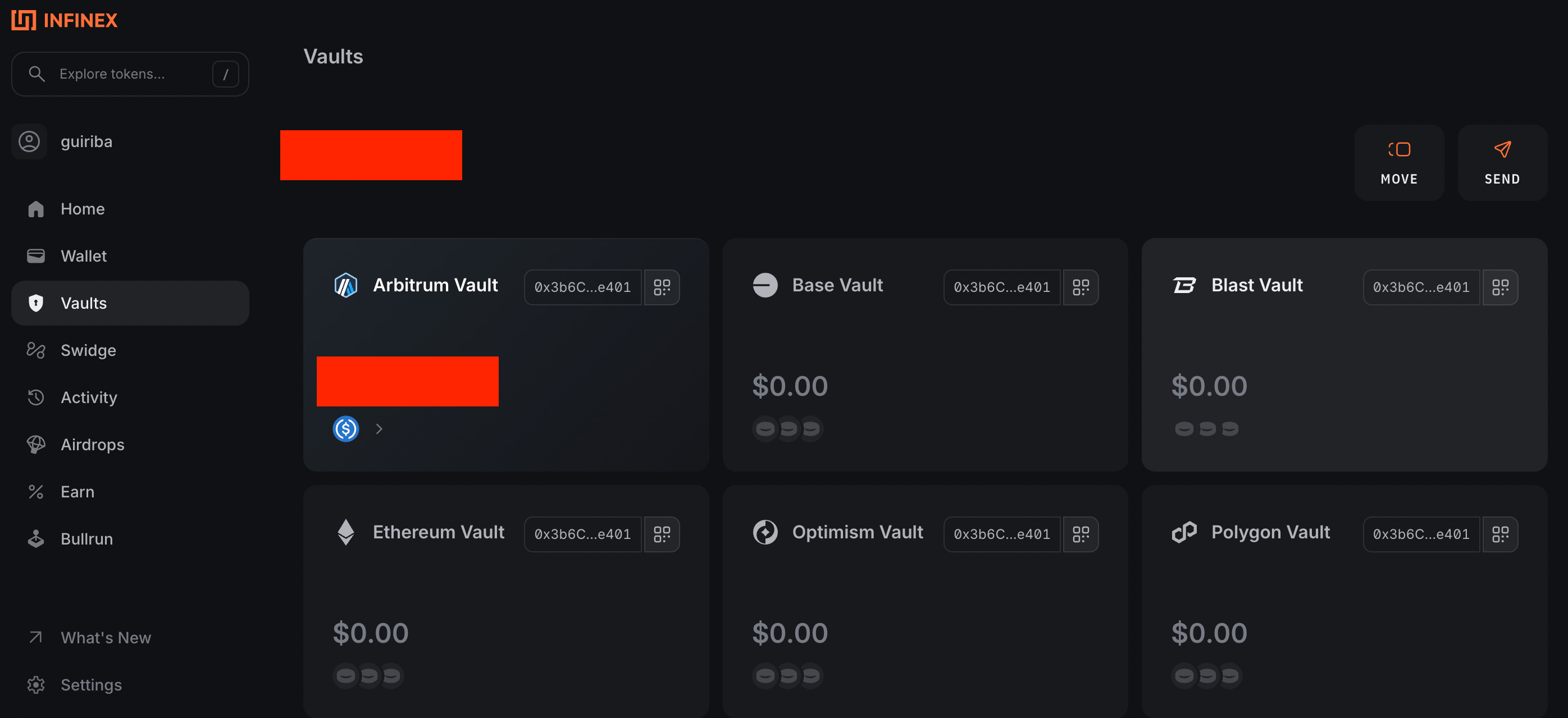 Para usar a Infinex, é preciso configurar uma vault - setando as configurações de recuperação - e depositar capital do seu endereço desejado.