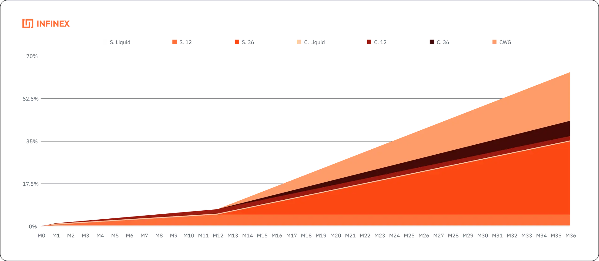 O Infinex emitiu 100.000 NFTs e ofertou-os a fundos de capital de risco, influenciadores e a sua comunidade. Tudo pelo mesmo preço para todos, mas com custos menores por aqueles que os mantivessem travados por 12 meses. Os valores variavam entre U$1.2K e U$5K por NFT.