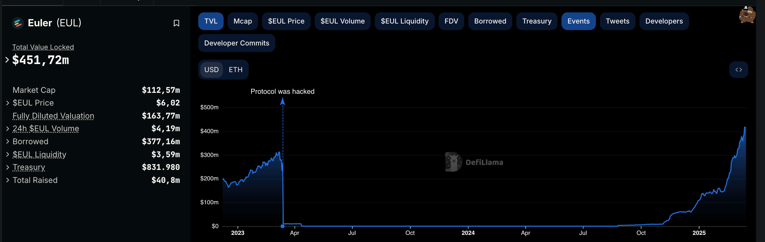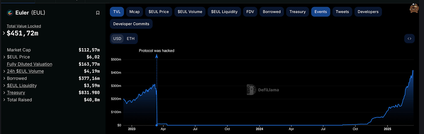 Hoje, a Euler Finance já superou seu TVL anterior: tem U$451M depositados em seus contratos.