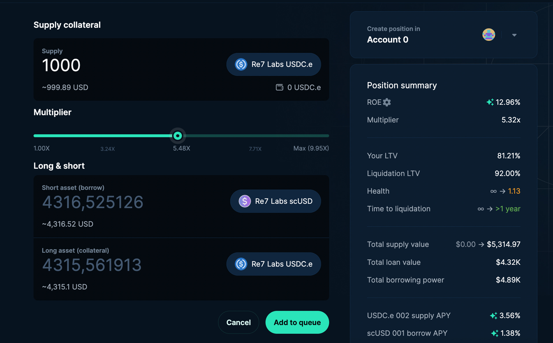 A rentabilidade para depositar USDC.e na Euler é de 3,3% a.a. Para emprestar scUSD é de 1,37% a.a. No Multiply da Euler, podemos nos alavancar em até 9,98x, obtendo uma rentabilidade máxima (ROE) de 23% a.a.