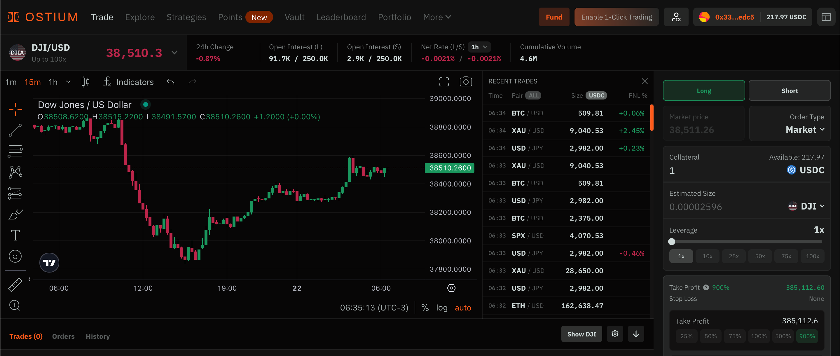 Já a Ostium, por outro lado, tem como foco facilitar a negociação de ativos tradicionais usando meios criptonativos. Assim, te permitem investir em índices como Nasdaq e Dow Jones ou Ouro e Cobre, com USDC. O objetivo é expandir este “cardápio” de ativos tradicionais, listando até ações negociadas em bolsas ao redor do mundo.