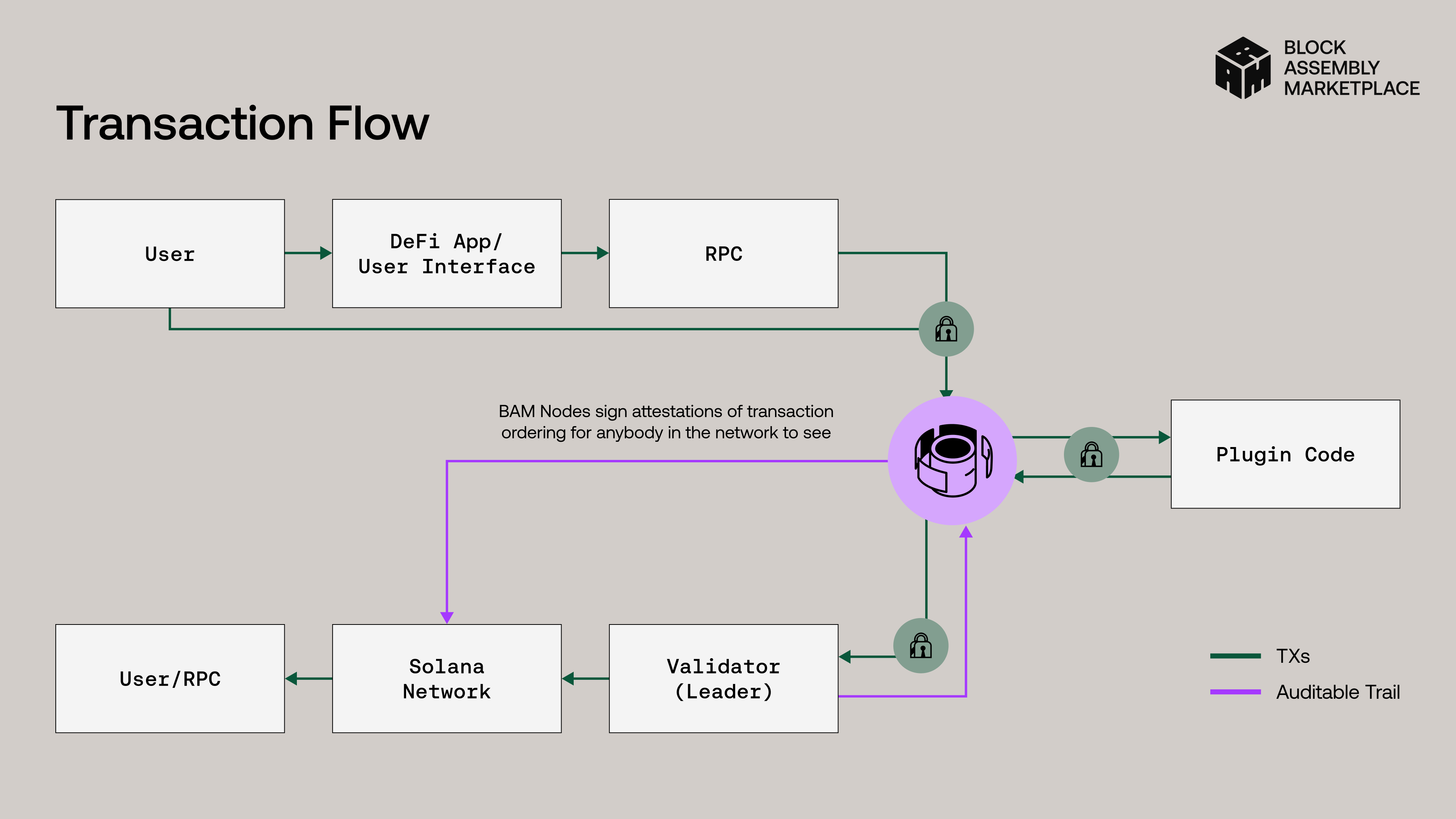 Uma vez que uma transação é submetida para um validador inserido no BAM, ela é criptografada e transmitida para a Solana. Ele não consegue reordenar transações, uma vez que não tem acesso às informações contidas nela. Para ele, todas serão iguais.