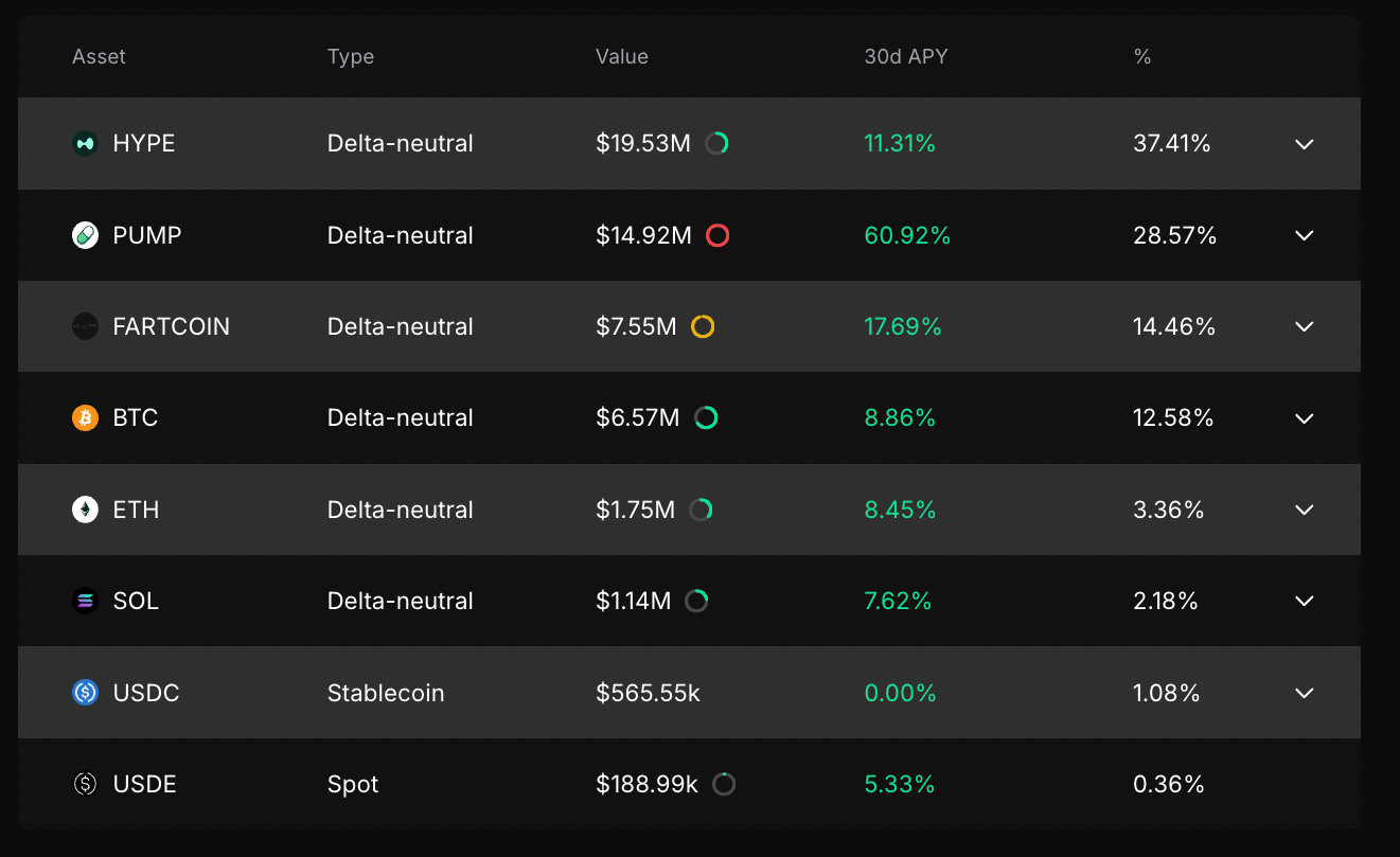 Em Protocol Holding, há os ativos disponíveis para captar as funding rates. Existem os mais conservadores, como $BTC, $USDe e $ETH, e os mais arriscados, como $PUMP e $FARTCOIN.