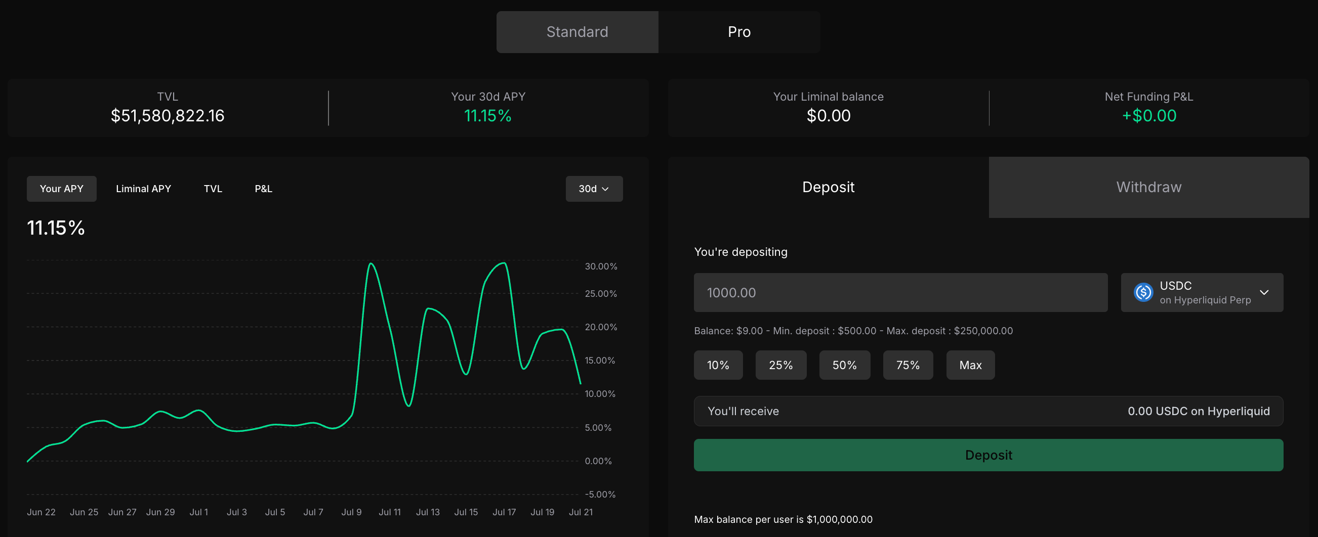 A interface do Liminal conta com duas modalidades: Standard e Pro. Recomendamos o uso da Pro, para ter mais liberdade em configurar sua estratégia e depósito no protocolo.