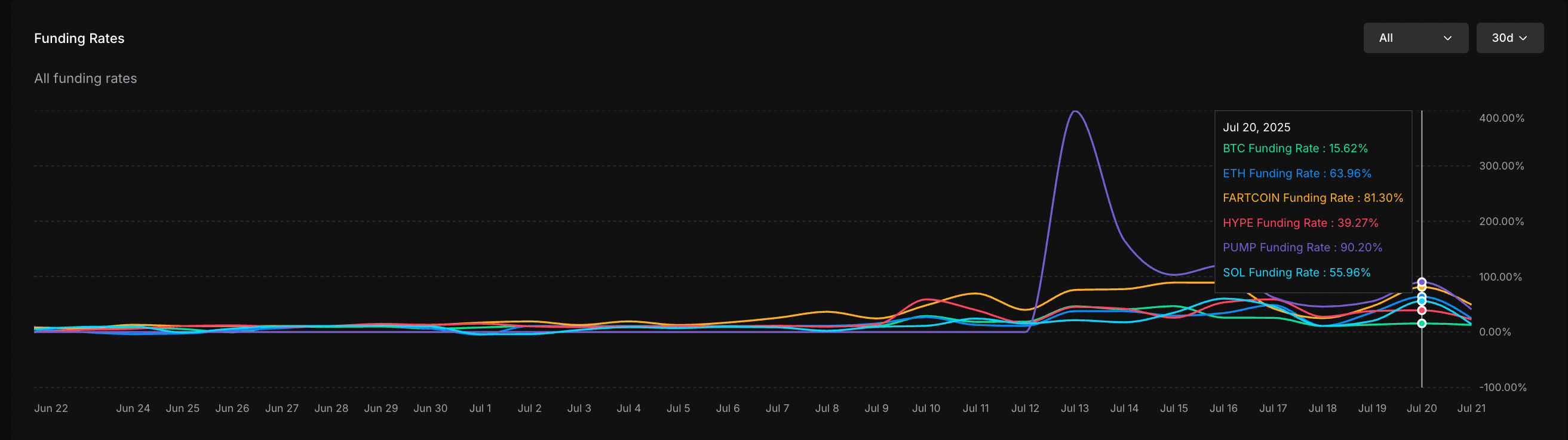 Mas é uma operação de gestão ativa, que incorre em vários riscos, como o de liquidação da posição em short, por exemplo. Você pode acompanhar as funding rates na Hyperliquid ou em CEX, e procurar o local mais rentável.