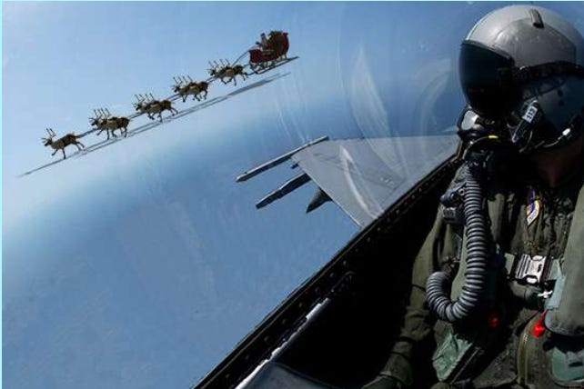 Quando o trenó chega à América do Norte, os militares simulam sua escolta com caças de verdade, gravando vídeos onde os pilotos acenam para o Papai Noel e fingem vê-lo nos céus.