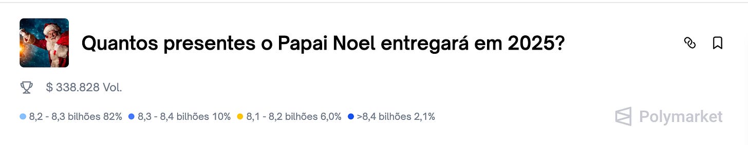 Isso porque, pela primeira vez, o contador de presentes do Papai Noel virou objeto de aposta na Polymarket.