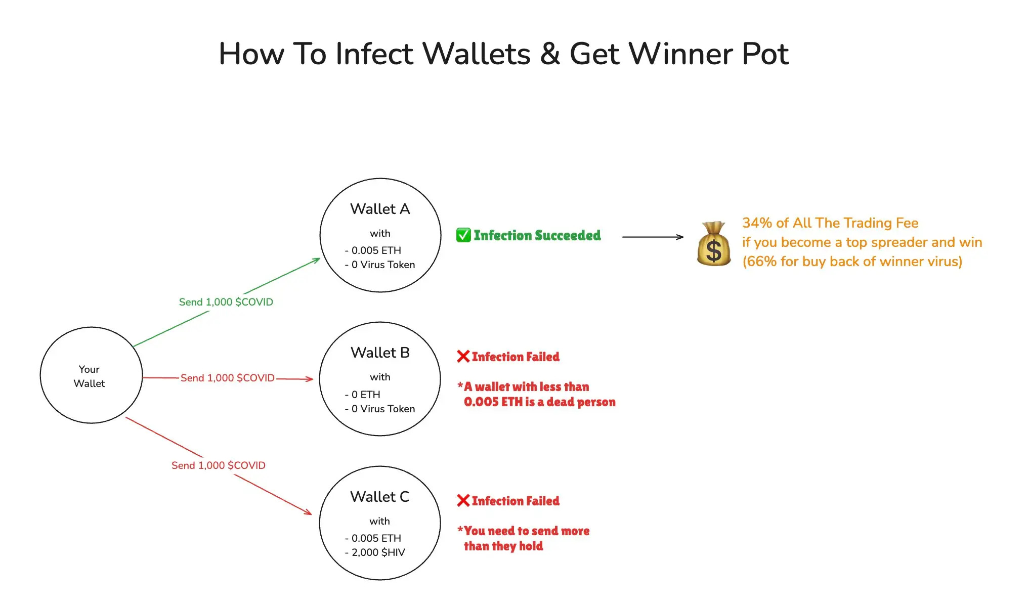 Para infectar um endereço com sucesso, é preciso que ele (1) tenha ao menos 0.005 ETH na carteira e (2) não tenha uma quantidade maior de tokens de outro vírus do jogo.