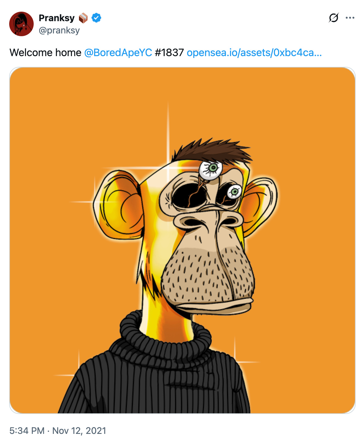 Um dos casos mais emblemáticos da jornada de Pranksy foi o do Bored Ape #1837, um NFT com pelagem dourada, uma das mais raras da coleção. Ele mintou esse macaco no dia 1º de maio de 2021 e o vendeu apenas três semanas depois por 11,49 ETH.