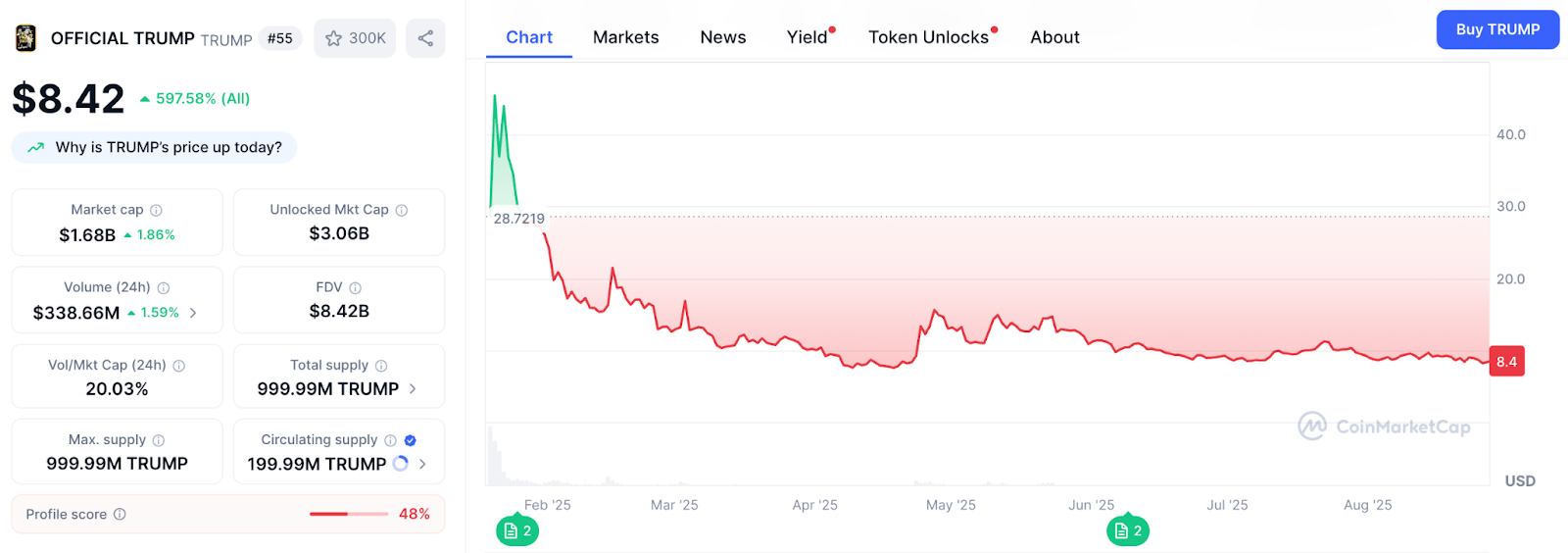 Já no início deste ano, apenas três dias antes de sua posse como presidente dos EUA, veio a memecoin $TRUMP. O token virou febre entre a base “Make America Great Again”, mas trouxe polêmica na mesma intensidade: taxas de negociação elevadas, insiders realizando lucros e pequenos investidores reclamando de prejuízo.