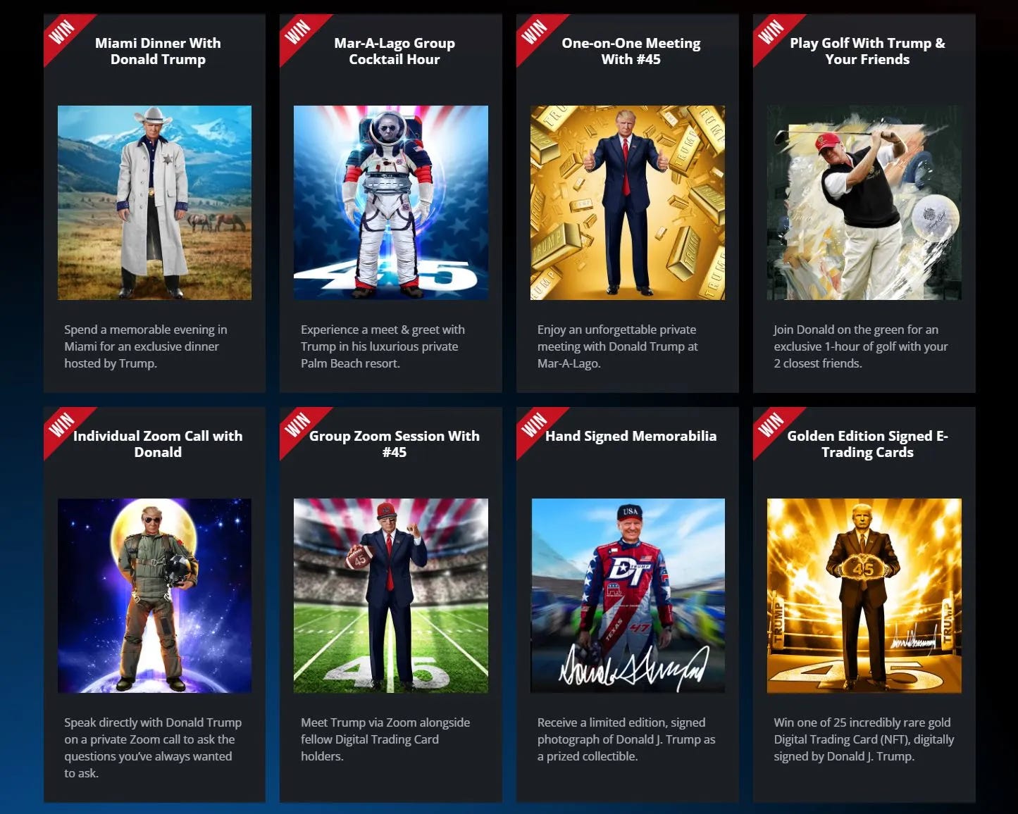 O World Liberty Financial não foi a primeira iniciativa da família na Web3. Em 2022, Donald lançou os Trump Trading Cards, NFTs que renderam milhões de dólares e esgotaram rapidamente. Além das imagens colecionáveis com poses caricatas, as cards vinham com benefícios inusitados: desde videochamadas até a chance de participar de um jogo de golf ou um jantar exclusivo com o próprio Trump.