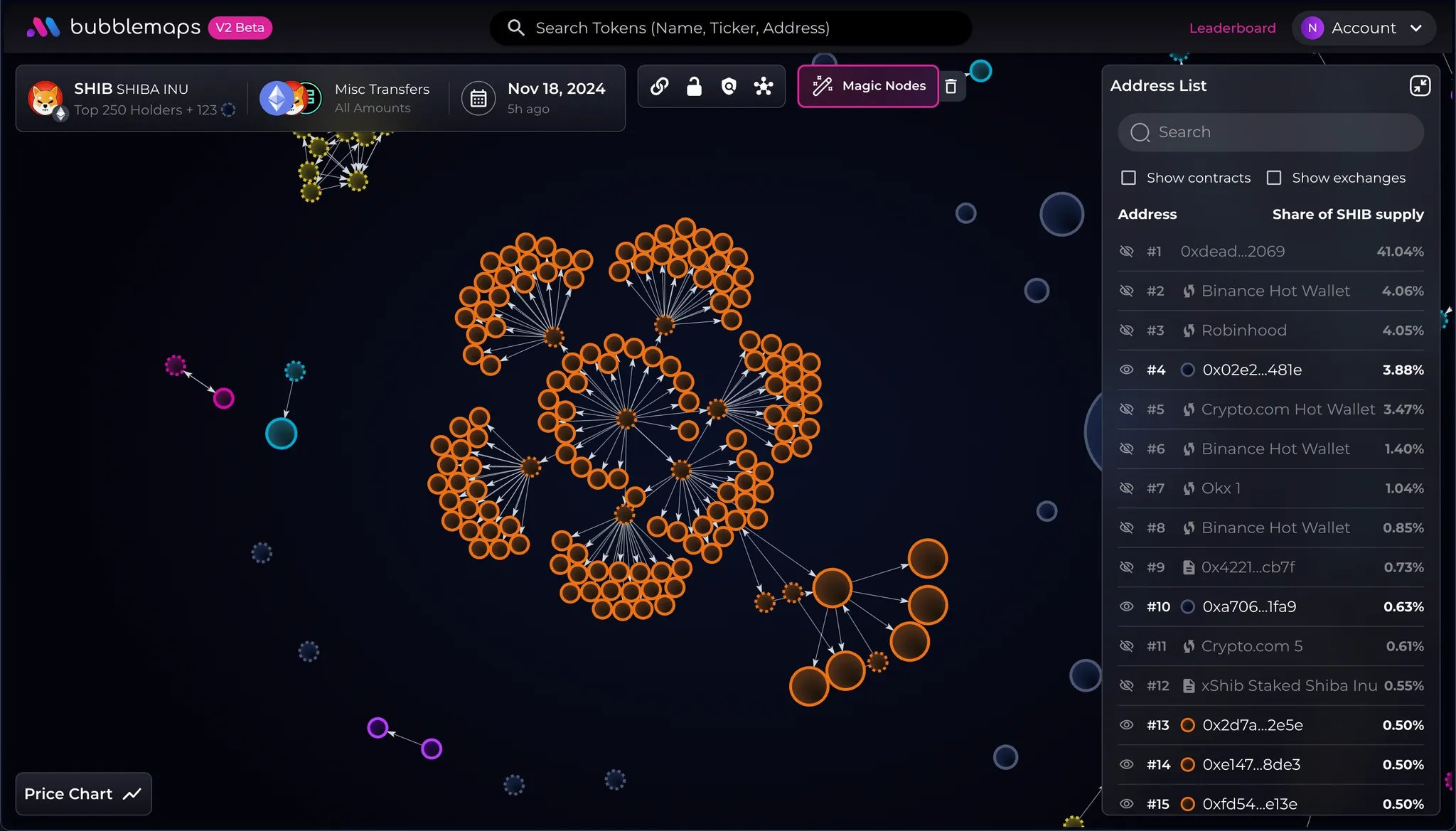 Na imagem acima, está a visualização da $SHIBA no Bubble Maps. Cada círculo é um endereço que holda o token. A direita, estão os endereços, os nomes dos potenciais detentores e a porcentagem que cada um deles possui naquela carteira.