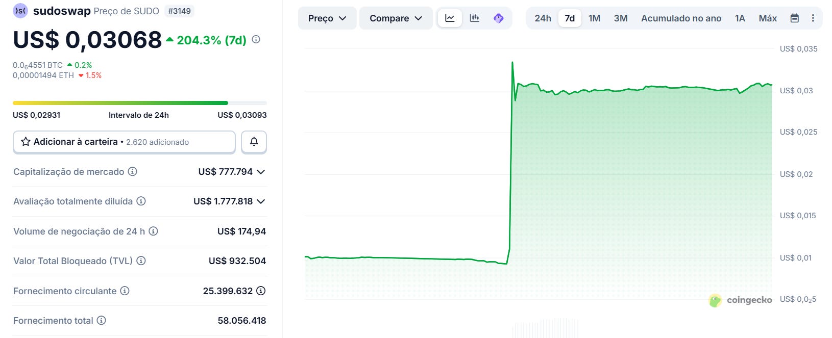 Duas horas após a proposta ser submetida, o preço do token subiu 200% e atingiu os U$0,03 — o valor “justo”, que poderá ser resgatado do tesouro da Sudoswap.