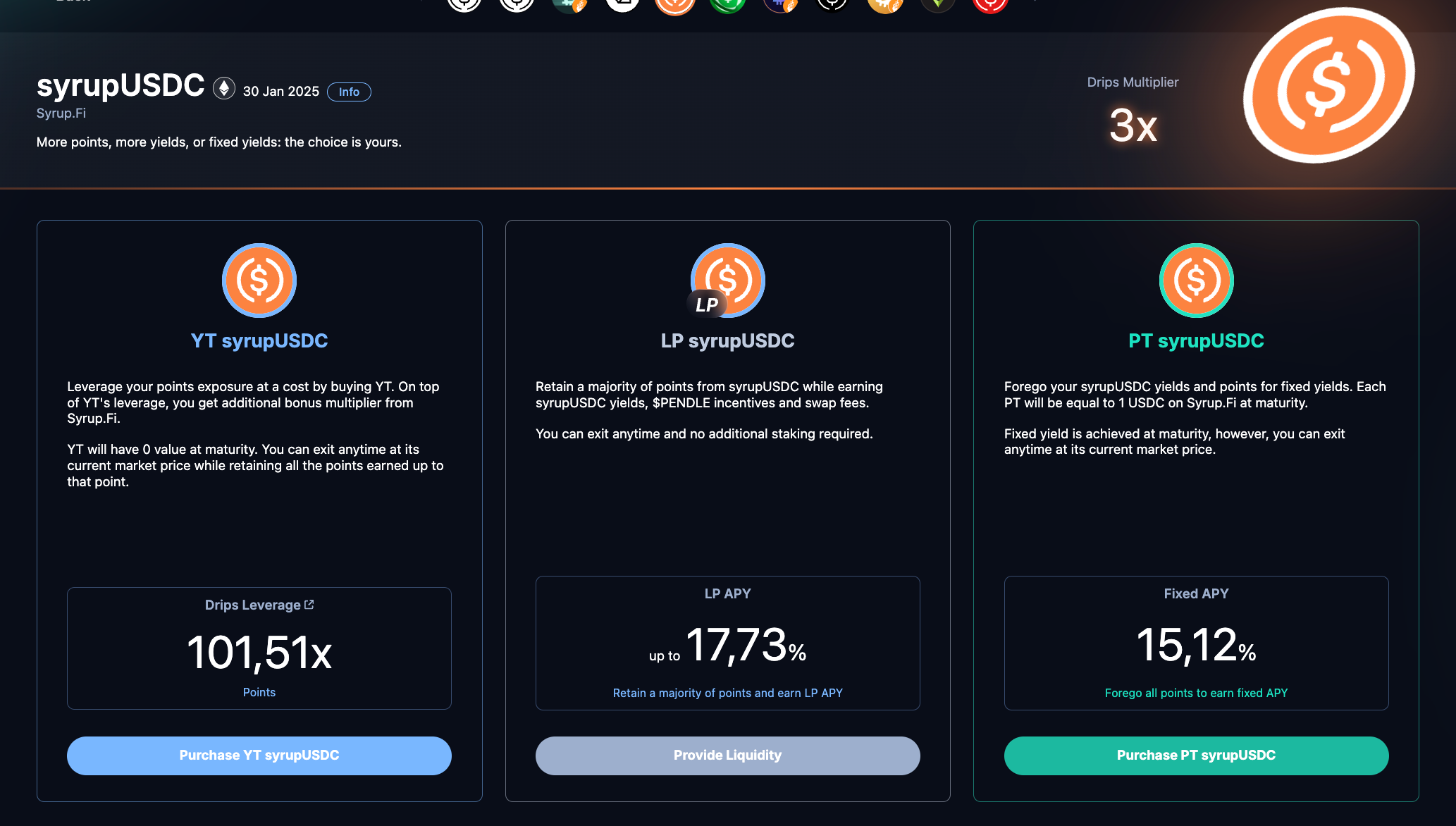 LP syrupUSDC: Forneça liquidez na Pendle com seu LP no Syrup, ganhando yield na Pendle e na Syrup - sem deixar de acumular pontos.