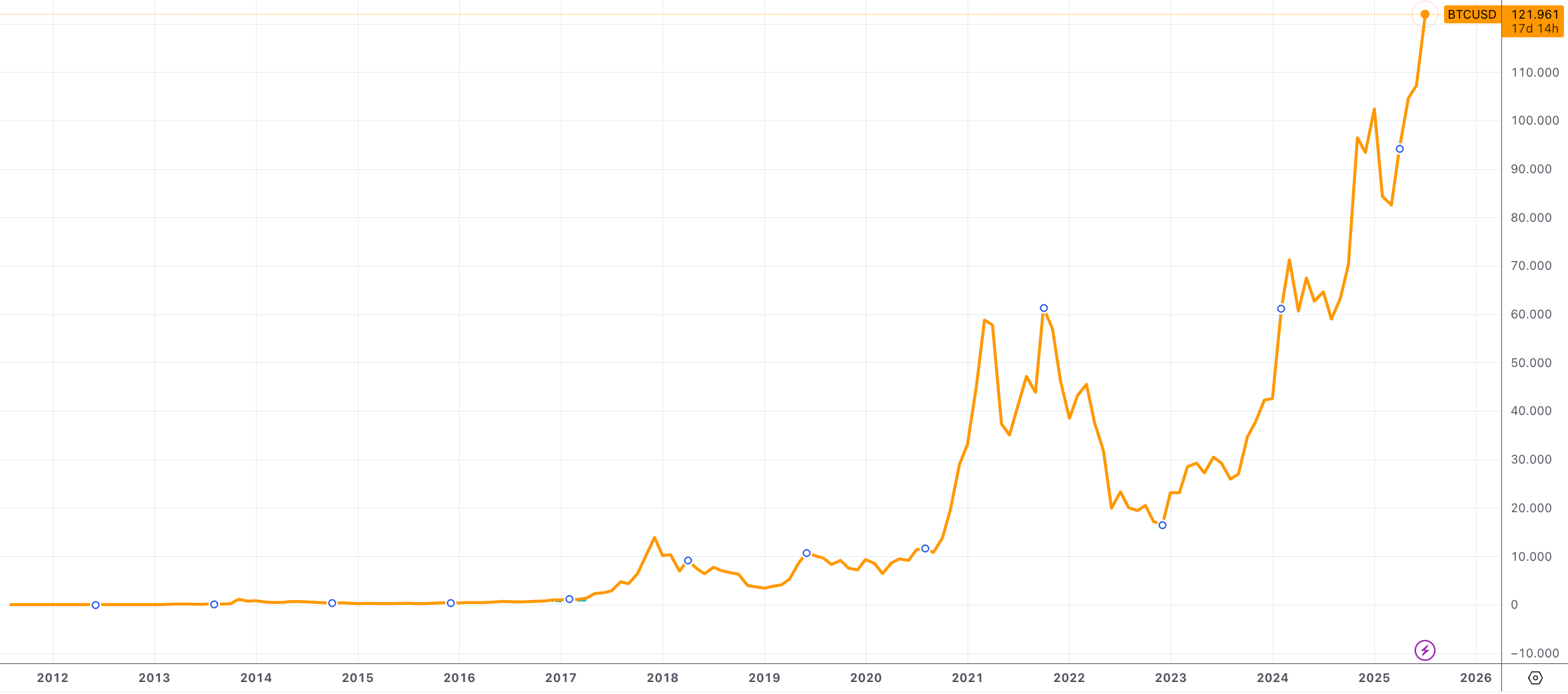 Nos últimos 10 dias, o BTC engatou uma valorização de ~15%, levando seu preço para o patamar dos U$120K. Uma nova máxima histórica foi alcançada.