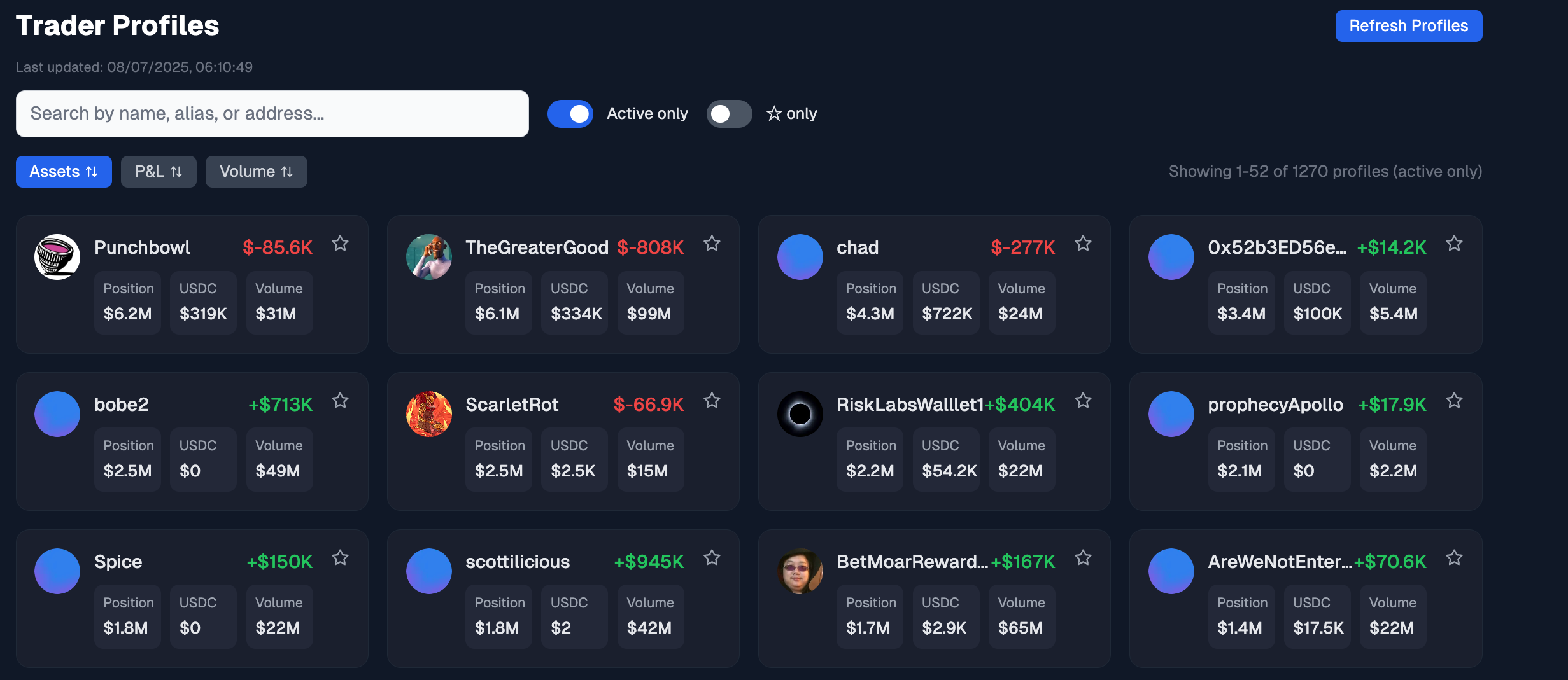 Na aba Profiles, é possível analisar o perfil de traders identificados na Polymarket.