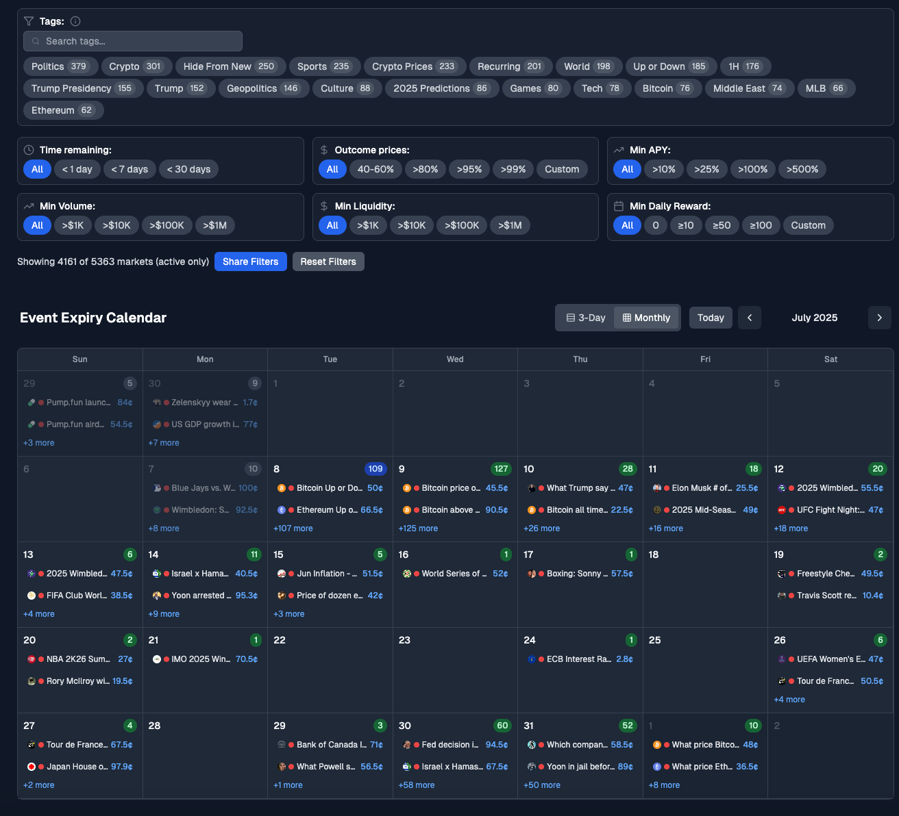 Ela organiza a data de todos os mercados abertos na Polymarket, incluindo até o preço das odds de cada um deles. É possível ver mensalmente, nos próximos 3 dias ou apenas daquele dia.